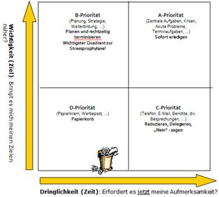 Aufgaben werden gemäß dem Eisenhower-Prinzip in wichtige und dringende Angelegenheiten unterteilt. Wichtig ist dabei zu unterscheiden, welche Aufgaben wann bearbeitet werden müssen. Dinge ohne bewusstes Nachdenken gleich anzupacken sollte dabei vermieden werden. Im Mittelpunkt sollte der Moment der Entscheidung stehen: Ist es wichtig? Dadurch können unwichtige Dinge auch aussortiert oder delegiert werden.