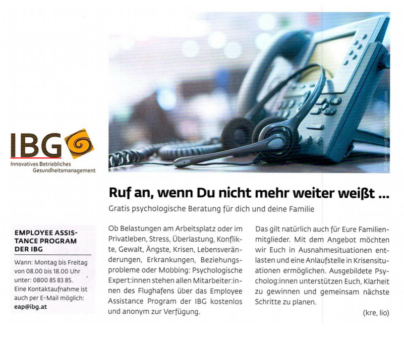Im Mitarbeitermagazin »Blockzeit« des Flughafen Wien wird das Angebot einer kostenlosen, psychologische Beratung (Employee Assistance Program) vorgestellt. Diese Hilfestellung erfolgt durch IBG-Expert:innen und richtet sich an Flughafen Wien Mitarbeiter:innen und deren Familie .