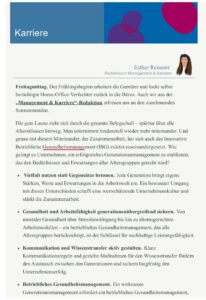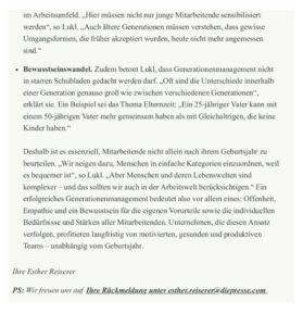 In ihrem aktuellen Newsletter thematisiert Esther Reiserer von Die Presse die Bedeutung eines erfolgreichen Generationenmanagements in Unternehmen . Wie lassen sich unterschiedliche Altersgruppendie Bedeutung eines erfolgreichen Generationenmanagements in Unternehmen. Wie lassen sich unterschiedliche Altersgruppen bestmöglich integrieren? Welche Maßnahmen helfen, Wissenstransfer zu sichern und Arbeitsfähigkeit langfristig zu erhalten?