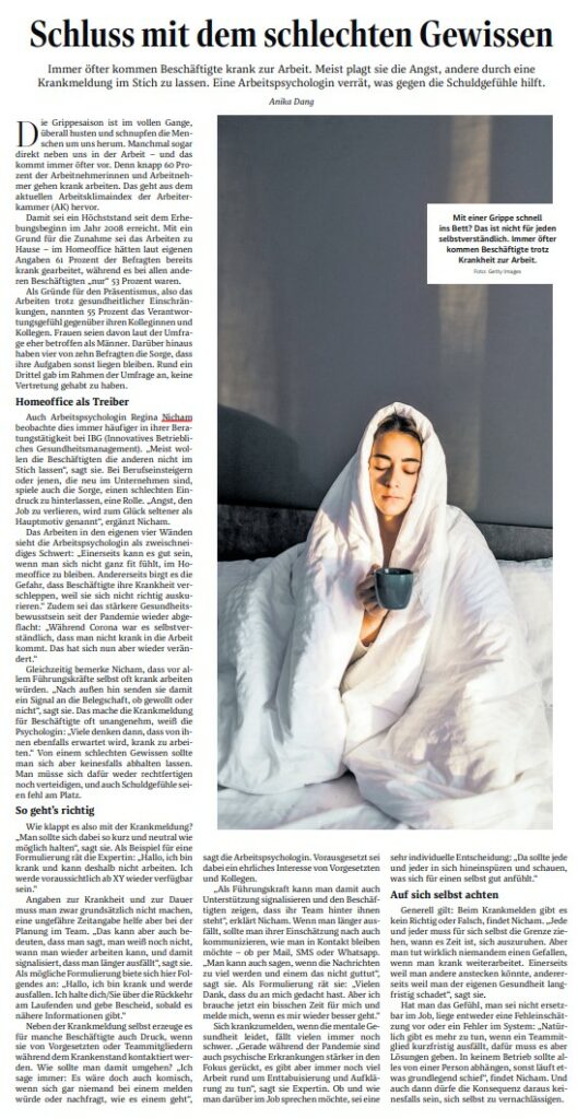 IBG-Arbeitspsychologin Regina Nicham spricht mit der Standard-Redakteurin Anika Dang über das Thema „Krankmelden ohne schlechtes Gewissen“. Immer häufiger gehen Beschäftigte trotz Krankheit zur Arbeit. Regina Nicham gibt wertvolle Tipps, wie man Schuldgefühle überwinden und gesundheitsbewusste Entscheidungen treffen kann.