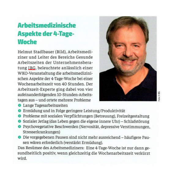 IBG Experte für Gesunde Arbeitszeiten Helmut Stadlbauer zeigt in der Mai Ausgabe des ÖKZ  die Probleme der 4-Tage-Woche auf aber auch unter welchen Umständen diese von Nutzen sein kann.